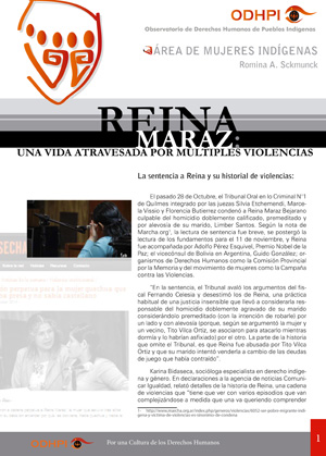 El Tribunal Oral en lo Criminal N°1 de Quilmes integrado por las juezas Silvia Etchemendi, Marcela Vissio y Florencia Butierrez condenó el 28 de octubre de a Reina Maraz Bejarano culpable del homicidio doblemente calificado, premeditado y por alevosía de su marido, Limber Santos. Según la nota de Marcha.org, la lectura de sentencia fue breve, se postergó la lectura de los fundamentos para el 11 de noviembre, y Reina fue acompañada por Adolfo Pérez Esquivel, Premio Nobel de la Paz; el vicecónsul de Bolivia en Argentina, Guido González; organismos de Derechos Humanos como la Comisión Provincial por la Memoria y del movimiento de mujeres como la Campaña contra las Violencias.